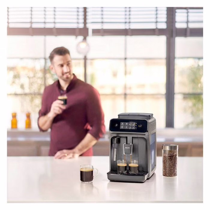 Máquina de café expresso com moinho integrado, compatível com grãos integrais ou café moído, com ecrã táctil intuitivo para uma utilização rápida e fácil. Pressão de 15 bar, para 1 ou 2 chávenas em simultâneo. Personalize a intensidade e o volume com a funcionalidade „My Coffee Choice“ e desfrute da clássica espuma de leite. Moinho de cerâmica com 12 configurações de moagem para uma qualidade de café ideal. Função de espera automática, autolimpeza e grupo de preparação amovível. Até 5.000 chávenas sem descalcificação graças ao filtro AquaClean. Cor preta, dimensões do produto: A 43,3 x L 24,6 x P 37,1 cm, peso líquido: 7,5 kg. Acessórios incluídos: copo de medição, fita de teste de dureza da água, tubo de massa lubrificante.