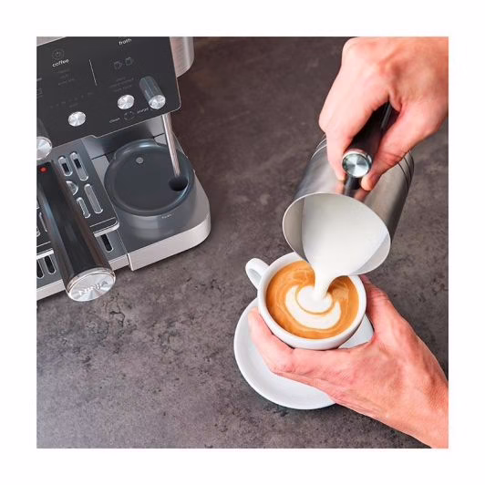 Máquina de café expresso com moinho integrado, compatível com grãos integrais ou café moído, pressão de 9 bar, preparação de 1 ou 2 chávenas. Tecnologia Barista Assist com calibração inteligente para uma dosagem e moagem ideais. Aquecimento rápido graças ao termobloco, com visor e interface intuitivos em inglês.