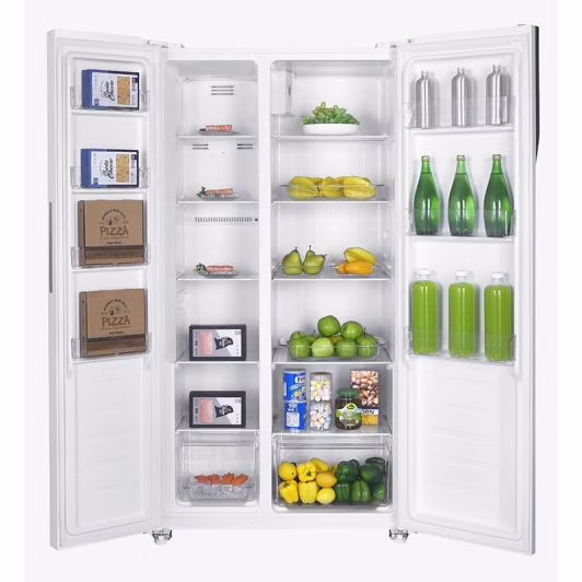Il frigorifero americano VALBERG SBS 442 E W742C combina grande capacità e facilità d’uso, ideale per famiglie di 4 persone. Con un volume totale utile di 442 litri, offre 291 litri per il frigorifero e 151 litri per il congelatore, posizionato a sinistra.